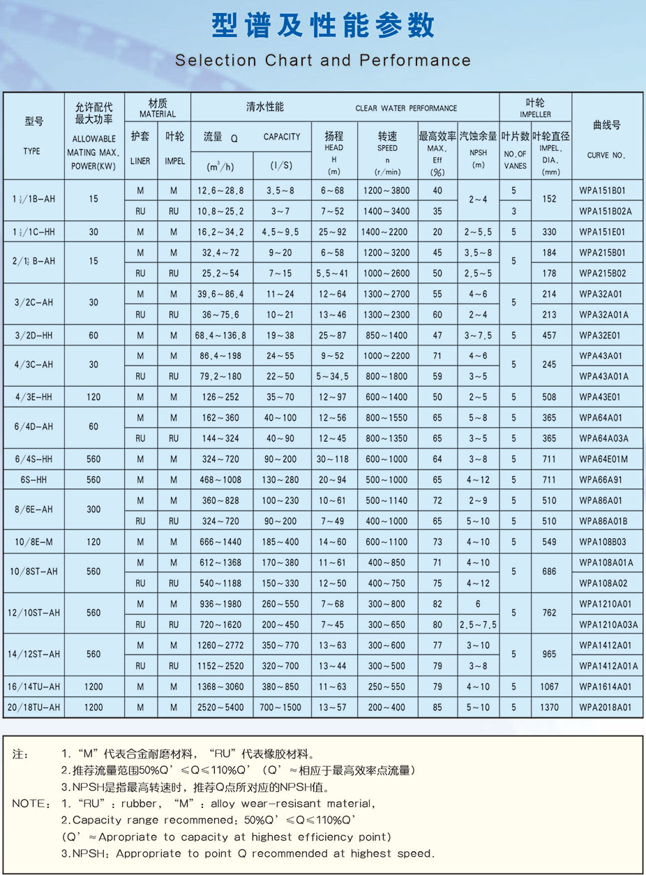 AH、M型渣漿泵具有可更換的耐磨金屬內(nèi)襯或橡膠內(nèi)襯,葉輪可以采用耐磨金屬或橡膠材料。HH型泵的內(nèi)襯和葉輪只有耐磨金屬。橡膠過流件適用于輸送含有細(xì)顆粒,不鋒利的漿體。